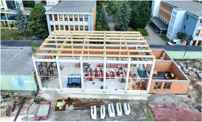 „Dokončili jsme železobetonovu konstrukci, děláme obvodové zdivo, je dokončená celá konstrukce krovu a následně se bude pokládat střecha. Po osazení všech oken se bude pokračovat s vyzdíváním štítů,“ uvedl při naší návštěvě stavbyvedoucí Jaroslav Cmol.